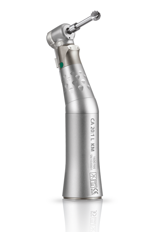 This contra-angle has an irrigation system which is internal to the instrument – a world first. So your grip is not impeded by the irrigation line. The jet of physiological liquid is projected onto the drill shaft itself,providing perfect cooling, particularly when using implant guides for insertions. The CA 20:1 has a miniature head and is the lightest on the market. In addition, its shafts and gears are machined in stainless steel with high resistance to saline solutions.