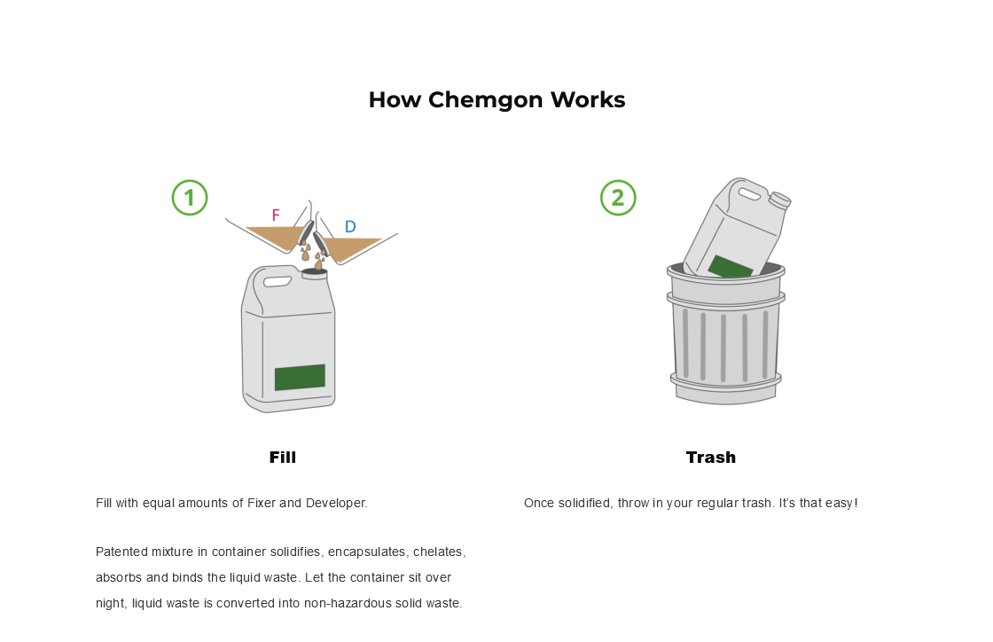 On the basis of Toxicity Characteristic Leaching Procedures (TCLP), Chemgon-processed graphic arts, photo processing fluids, and X-ray fluids are converted to a non-hazardous solid waste safe for regular trash disposal; silver levels are well below the acceptable parts per million (PPM) established by the EPA. Chemgon converts hazardous liquids into non-hazardous solid waste