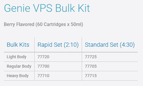 Genie is chemically engineered to produce remarkably detailed and precise impressions every time you use it, no matter which technique you use. Genie is available in a full range of wash and tray materials - five viscosities and two set times.