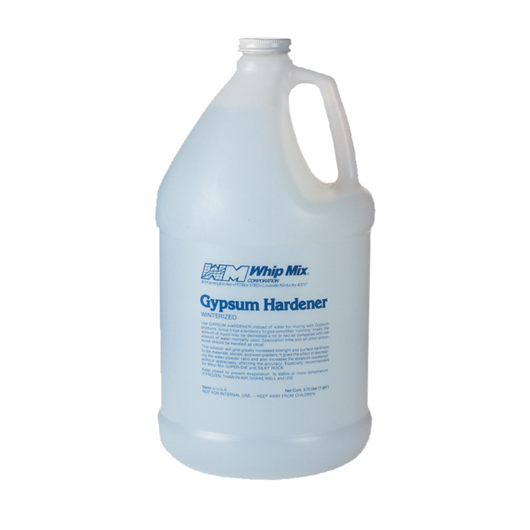 Replaces water as the gauging liquid for mixing with gypsum materials where increased hardness and reduced brittleness are desired; will also improve the “running” or flowing quality of the mix. It does not clinically affect the other properties of the die or model materials or plasters. This formula is not damaged by freezing.