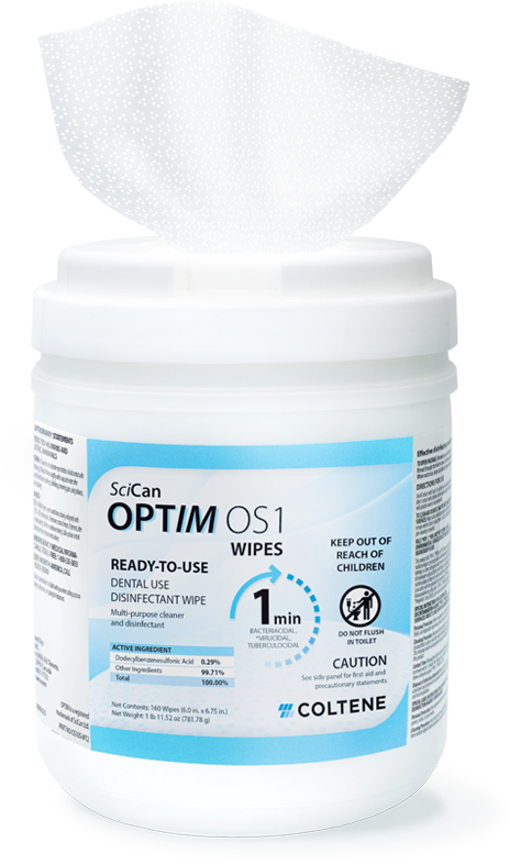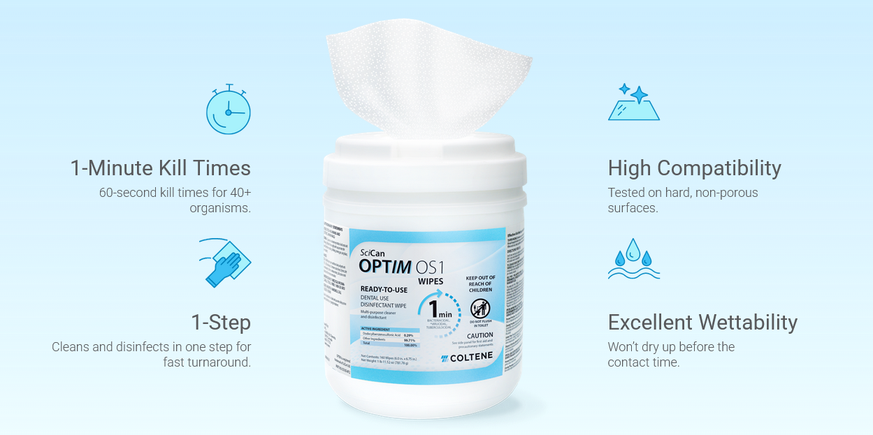 OPTIM OS1 is safe to use on upholstery, plastics, elastomers and metals. It’s formulated with the LAS Active System, an ingredient used for 40+ years in the food and service industries. OPTIM OS1 seamlessly cleans and disinfects stainless steel, anodized aluminum, Corian countertops, silicone, and other hard, non-porous materials common in dental offices.