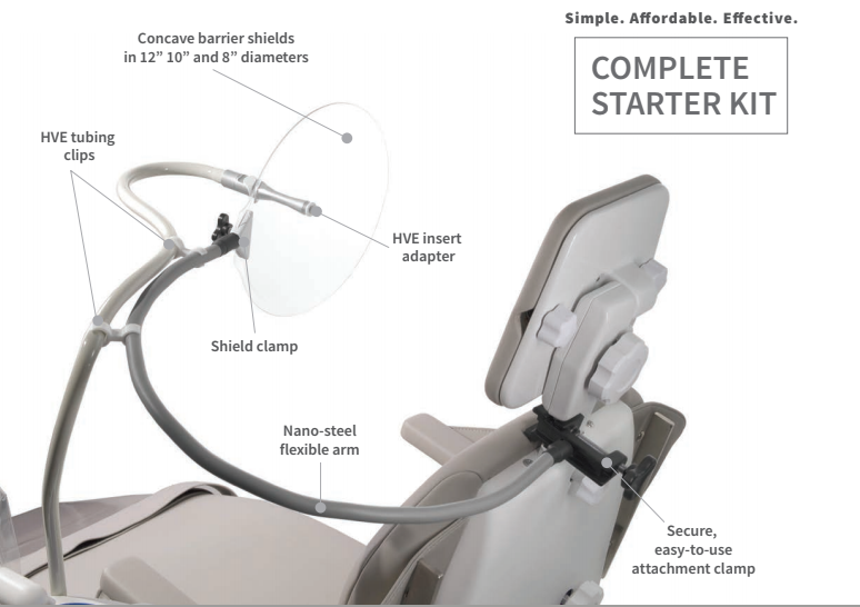 shieldVAC™ Complete Starter Kit combines high-volume suction and a concave barrier shield to reduce airborne bacteria, viruses and debris by capturing up to 95% of aerosols, droplets and splatter expelled during dental procedures.