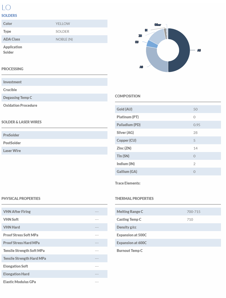 A yellow solder with a flow temperature of 710 Celcius, for use with all classifications of crown and bridge, and porcelain fused to metal alloys.
