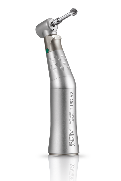 This contra-angle has an irrigation system which is internal to the instrument – a world first. So your grip is not impeded by the irrigation line. The jet of physiological liquid is projected onto the drill shaft itself,providing perfect cooling, particularly when using implant guides for insertions. The CA 20:1 has a miniature head and is the lightest on the market. In addition, its shafts and gears are machined in stainless steel with high resistance to saline solutions.