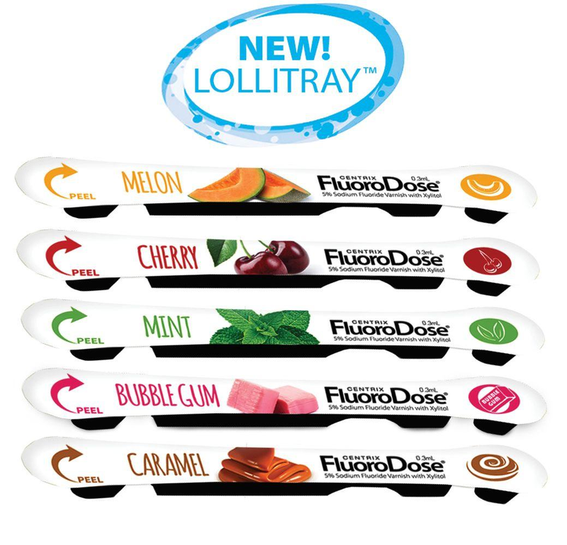 FluoroDose contains 5% sodium fluoride, the maximum dosage allowed in a convenient single-use LolliPack®. Each unit contains one single dose (0.3mL) of FluoroDose plus one Benda® Brush applicator. Simply peel back the cover, dip in the brush, mix and apply. Centrix makes fluoride varnish safer and cleanup easier.
