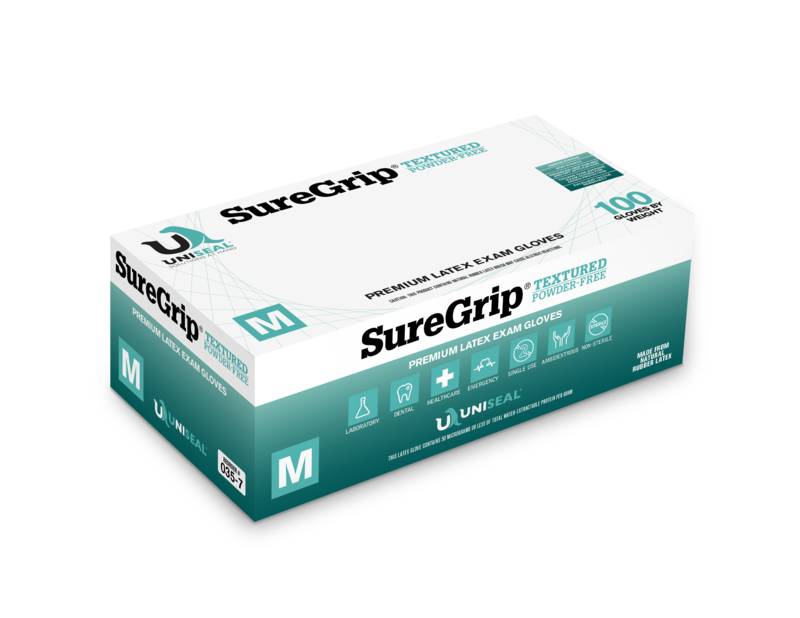 Micro-textured for a better grip, Uniseal SureGrip® Powder-Free Textured Latex Exam Gloves are used in laboratories, hospitals, dental institutions or other environments where items can get wet. They are washed in chlorine base to remove skin-irritating proteins, so they meet the FDA’s definition for a “low-protein” glove. While most powder-free gloves are yellow in color, the Uniseal® SureGrip® is white and does not retain a chlorine odor. Complies with the American Dental Association (ADA) Spec. No. 76-1991.