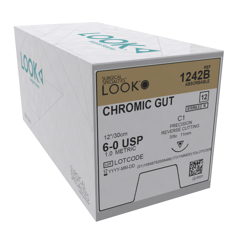 LOOK Chromic Gut sutures are absorbable, sterile surgical sutures composed of purified connective tissue derived from either the serosal layer of beef or the submucosal fibrous layer of sheep intestines.