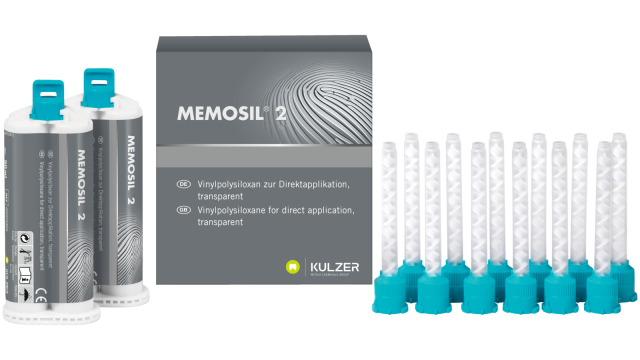 MEMOSIL 2 is a transparent A-silicone for special indications. Its transparency allows optical control when positioning aids (e.g. X-ray pellets). Light-curing is possible for filling and fixative materials through placeholders with MEMOSIL 2.