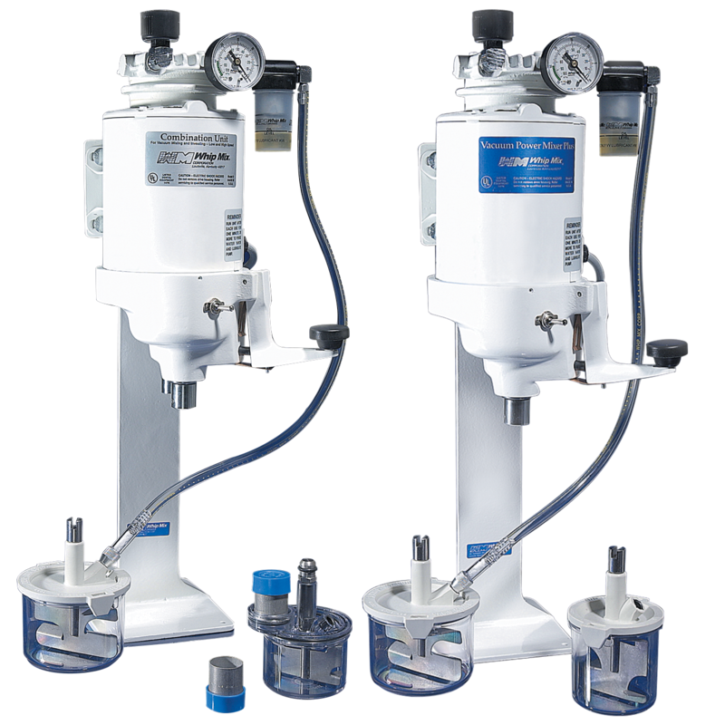 The Combination Unit is equipped with two drive shafts which rotate at different speeds. The faster speed (1,725 RPM) reduces mixing time required for small quantities (90 gram or less) of investment. The slower speed (425 RPM) is for all mixing purposes, with or without vacuum.