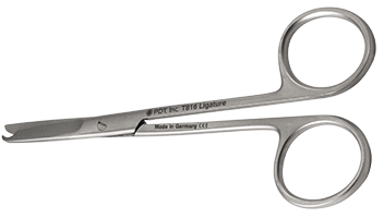 Stainless steel 13 cm Ligature Scissors feature a hook on the end to grasp sutures.