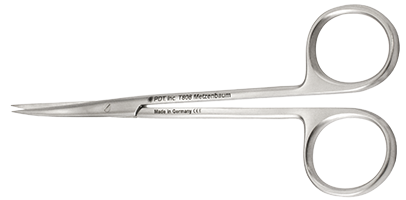 Stainless steel 14.5 cm Metzenbaum Pointed Curved Scissors have narrow blades designed for cutting delicate tissue and blunt dissection.